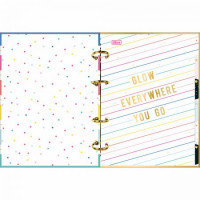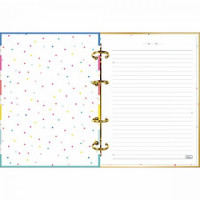 O Caderno Argolado Cartonado Colegial Be Nice 160 Folhas possui formato compacto, é leve e bastante funcional. Vem com capa dura com detalhe metalizado e parte interna decorada, divisórias, folha adesiva, folhas pautadas e bolsa plástica para guardar trabalhos e anotações.