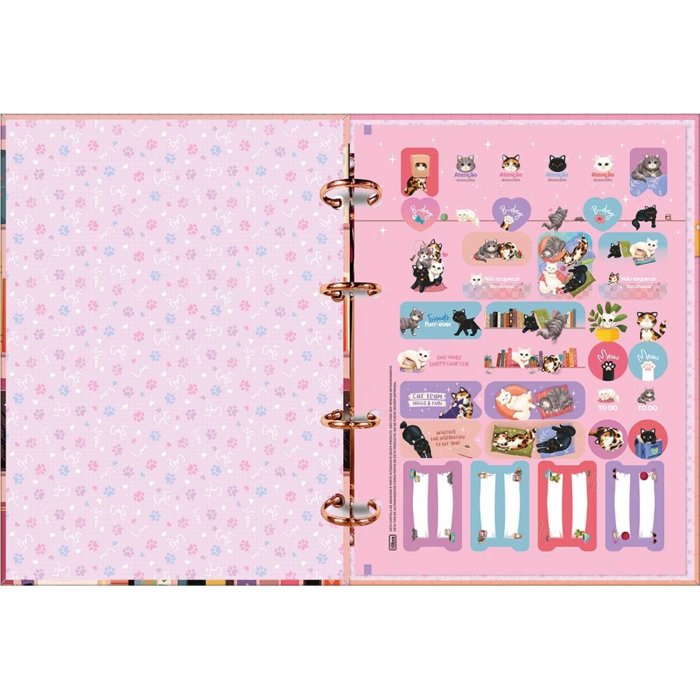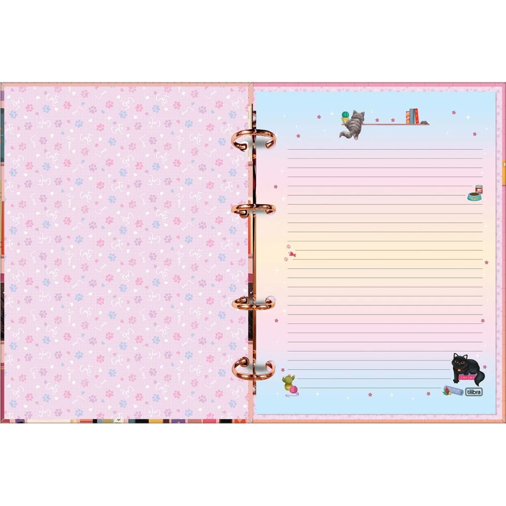 O caderno argolado Tilibra possui capa dura com detalhe metalizado e parte interna decorada, oferecendo um visual inspirado em gatinhos fofos e muito divertidos. O produto também vem com adesivos, bolsa plástica para guardar trabalhos e anotações, jogo com seis divisórias e refil de 80 folhas pautadas e decoradas. Adquira agora o seu!