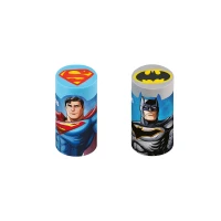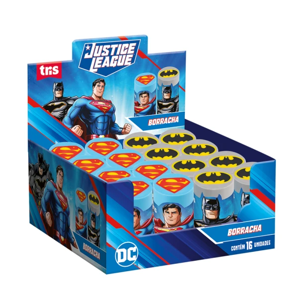 A Borracha extrusada Liga da Justiça tem a estampa do super herói em todo seu interior e textura macia. É não tóxica e tem rótulo plástico protetor.