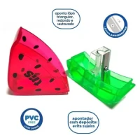 Apontador com depósito em formato de melancia, alegre e prático. Conta com lâmina antiferrugem para maior durabilidade e compartimento para guar dar os resíduos, ajudando a manter seu espaço sempre limpo.