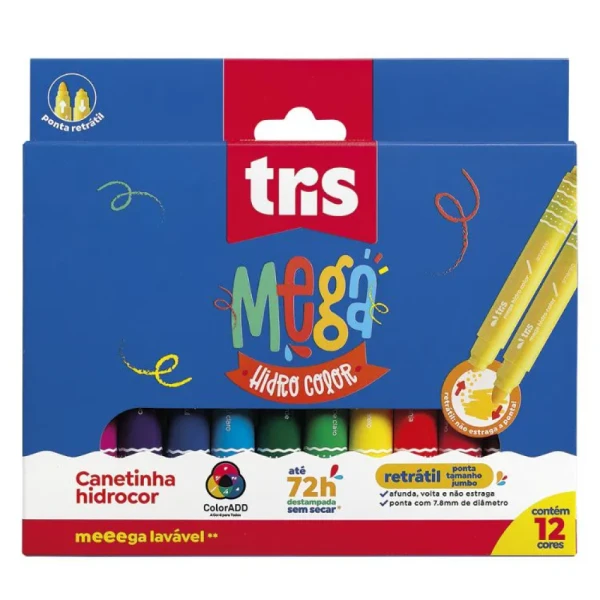 A linha de colorir MEGA TRIS é perfeita para soltar a criatividade com qualidade e praticidade. Possui ponta SUPER jumbo retrátil, basta apertar, que a ponta afunda e não estraga. Pode ficar até 72 horas destampada sem secar e a tinta é super lavável.