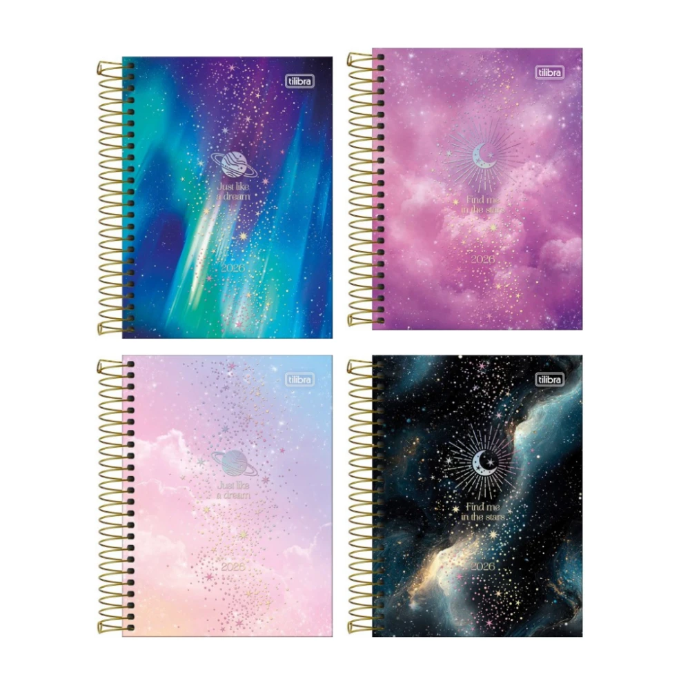 Se você busca um produto inspirado nas influências dos astros e mistérios cósmicos, a agenda espiralada Magic da Tilibra é a escolha perfeita. O produto tem tamanho 11,7 x 16,4 cm, capa dura com detalhes metalizados, bolsa de papel, adesivos e folhas com visão de 1 dia por página, exceto aos sábados e domingos. Esta agenda 2026, que possui 176 folhas e conteúdo temático em QR Code, é escolha ideal para manter todas as tarefas e compromissos bem programados.