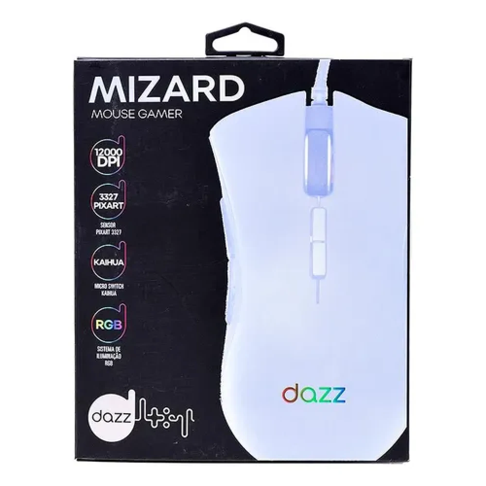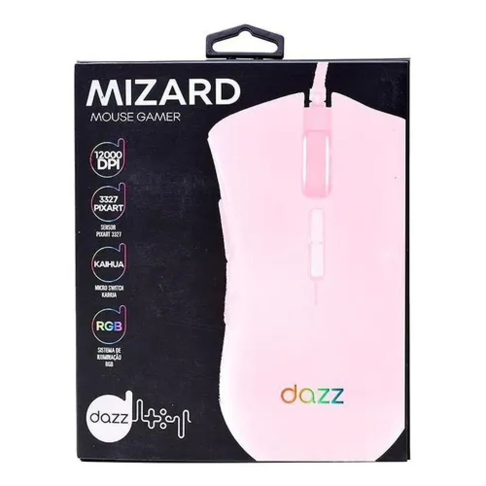 Mouse Gamer Mizard com sensor Pixart 3327, micro switch Kaihua, iluminação RGB e 7 botões. Pesa apenas 78g para movimentos ágeis e precisos.