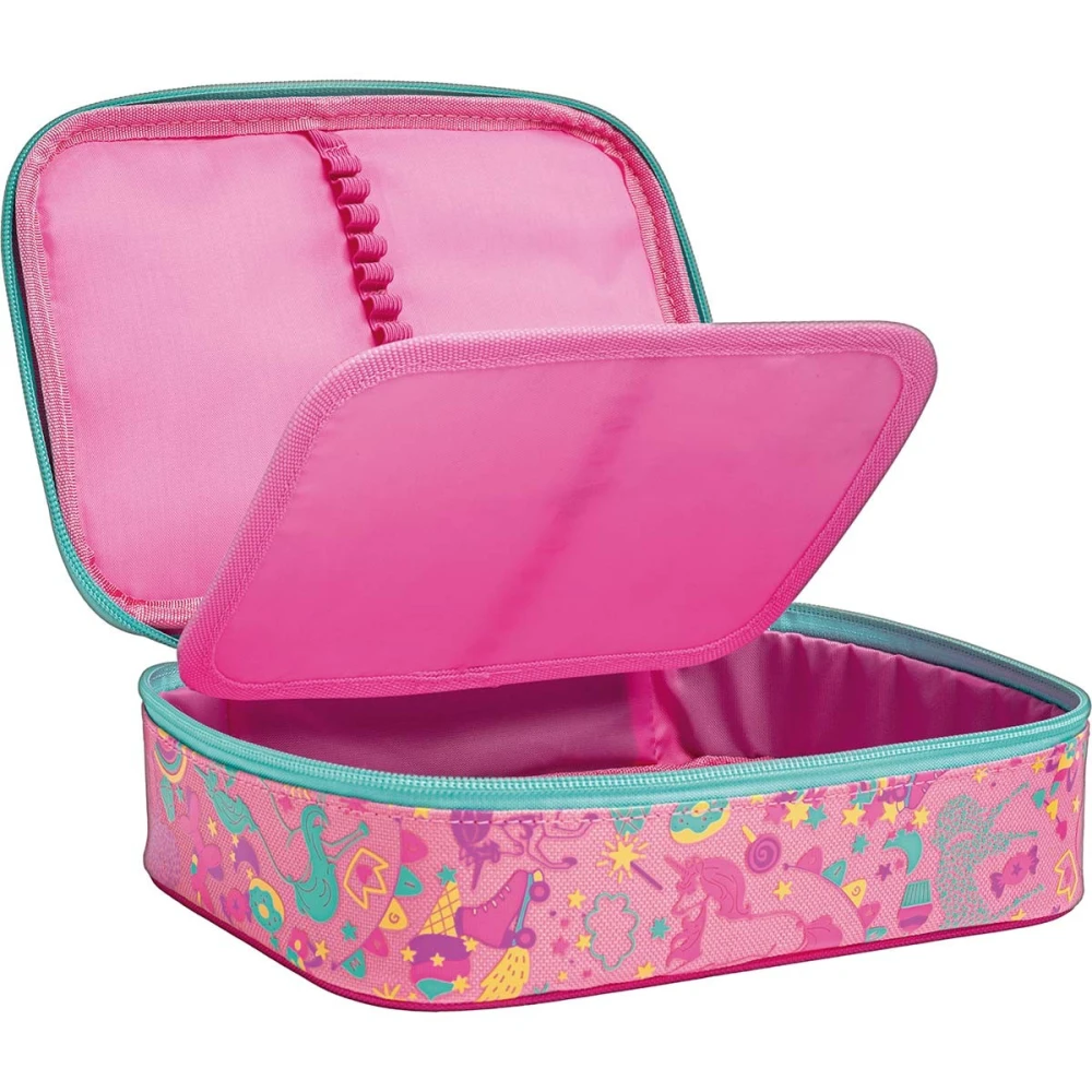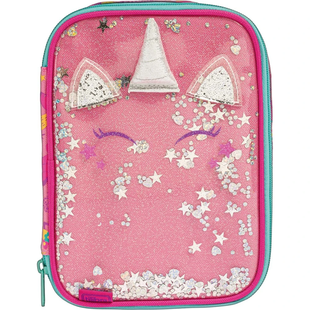 O Estojo Box Blink da Tilibra é incrivelmente prático e espaçoso, perfeito para quem precisa armazenar muitos lápis, canetas e outros materiais e acessórios. Este modelo tem a parte frontal feita de material plástico transparente e decorada com floquinhos prateados, criando um efeito visual mágico para o rosto do unicórnio. Com fechamento em zíper e uma divisória central com elásticos, o estojo ajuda na organização, garantindo que tudo esteja sempre em ordem e ao alcance das suas mãos.