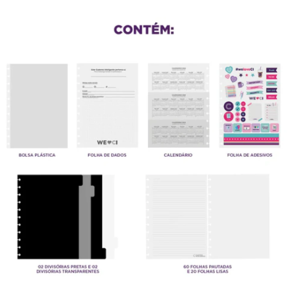 Inteligine - Acompanha capa e contracapa rígidas, 1 folha de instrução de uso e manuseio, refis e acessórios disponíveis no verso, 1 folha de identificação com calendário no verso, 50 folhas lisas offset 120g e 1 suporte com elástico para 1 caneta ou 1 lápis.