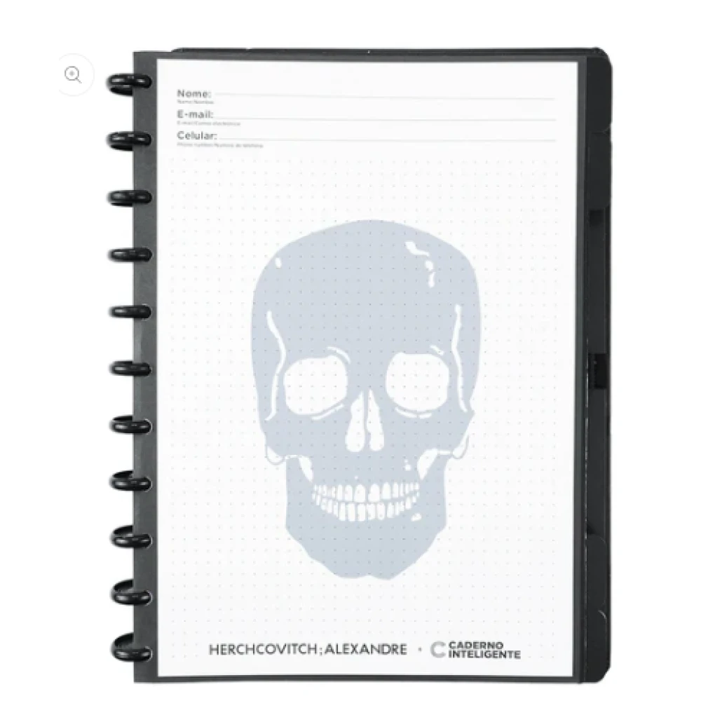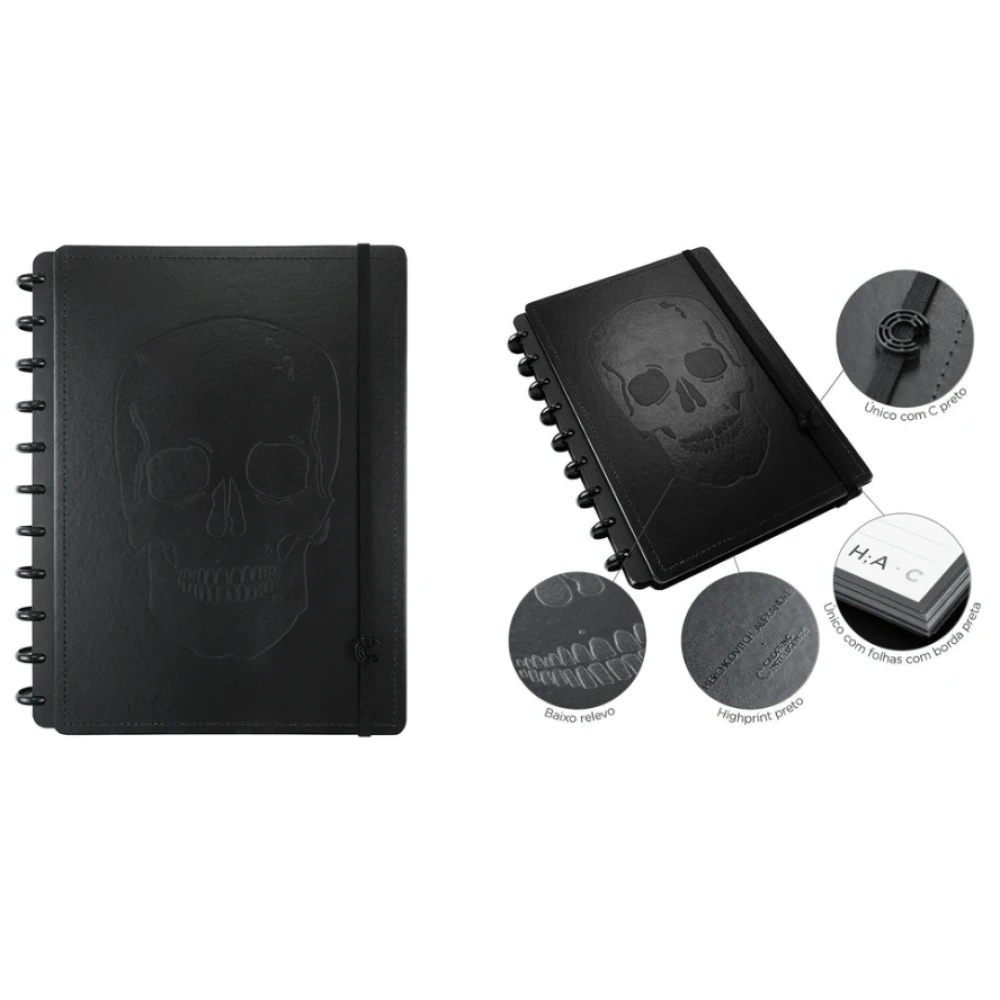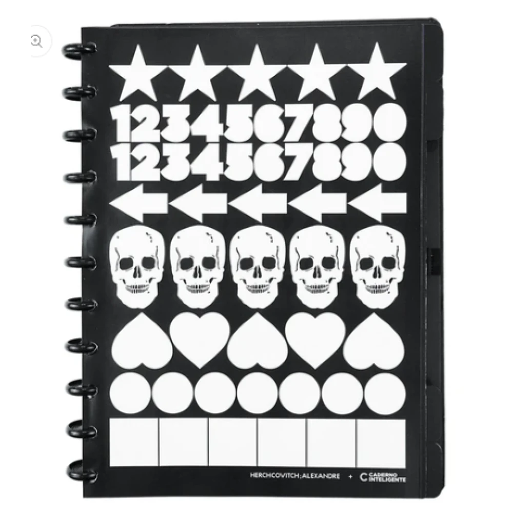 O modelo Black Ink traduz a sofisticação de uma moda que pensa, escreve e se manifesta com autenticidade. O icônico símbolo da caveira – marca registrada do estilista – ganha destaque em um refinado acabamento em baixo-relevo. Na contracapa, o detalhe em serigrafia se soma a adesivos exclusivos e ao design das folhas com moldura em preto, resultando em um Caderno Inteligente único e exclusivo.