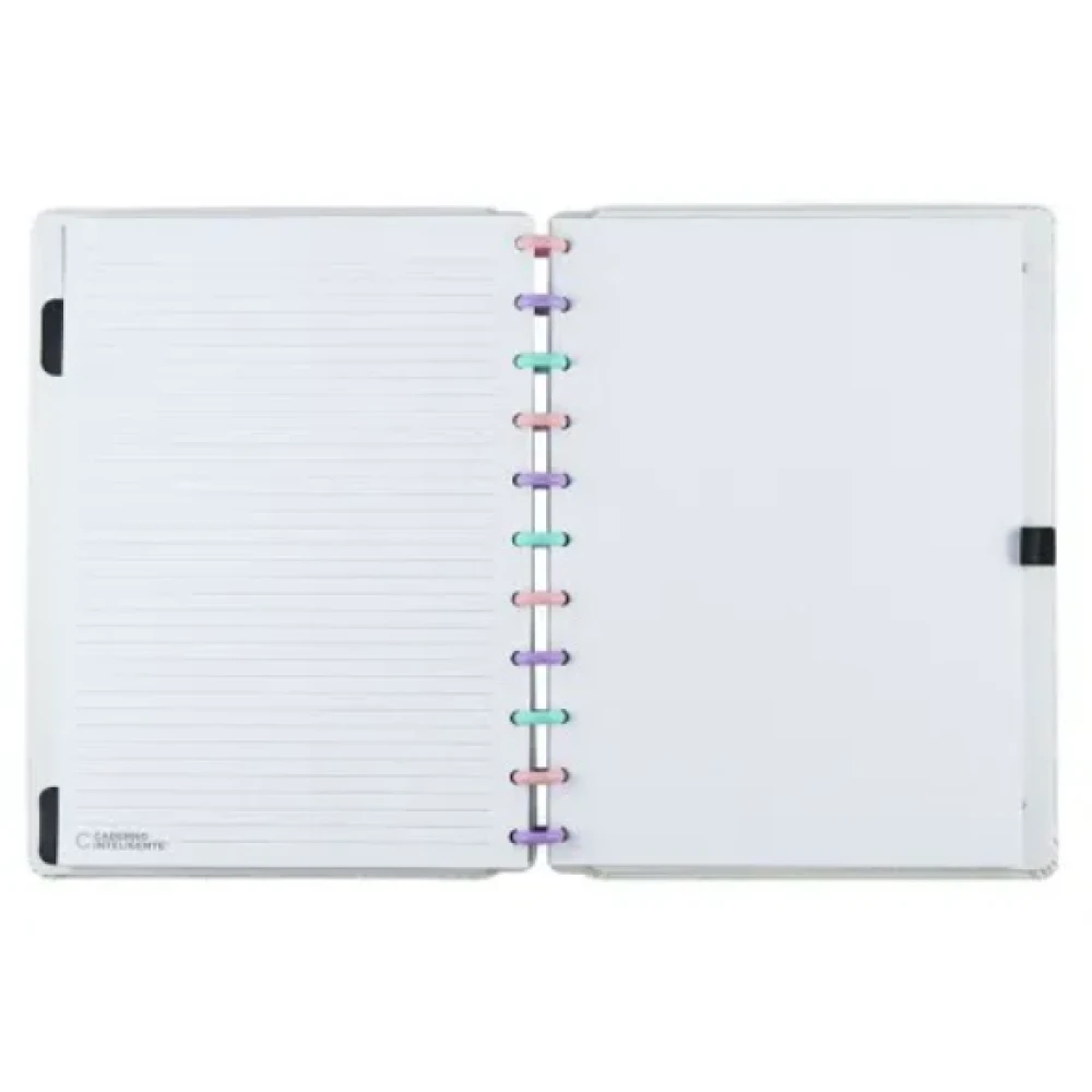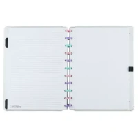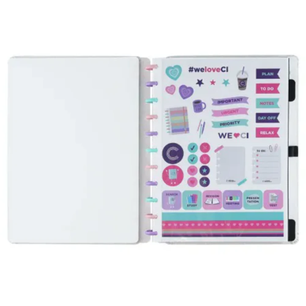 Capa e contracapa rígidas, 01 folha de adesivos, 01 bolsa plástica, 01 folha de instrução de uso e manuseio, com refis e acessórios da marca disponíveis no verso, 01 folha de identificação com calendário no verso, 04 divisórias com abas para identificação, 80 folhas offset 90g (60 folhas pautadas e 20 folhas lisas brancas para impressão), 01 suporte com elástico para 01 caneta ou 01 lápis e discos M + elástico.