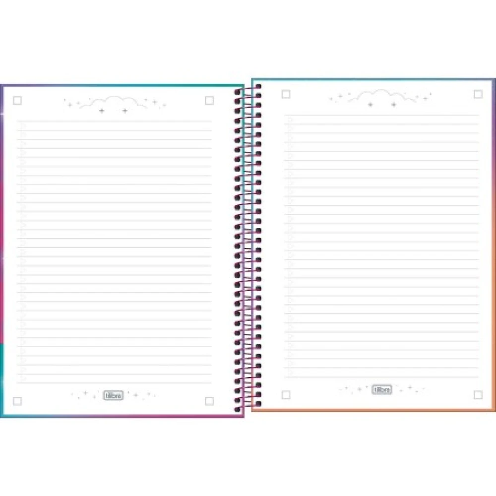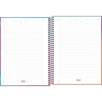 Use este modelo, com capa dura com a parte interna decorada, bolsa de papel para guardar trabalhos, adesivos funcionais, folhas pautadas e espiral colorido, para anotar as aulas, fazer resumos, listar tarefas e organizar as ideias de forma prática e eficiente.