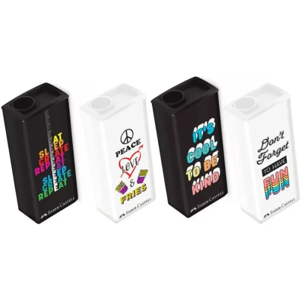 A qualidade dos apontadores Faber-Castell em 4 novas estampas atuais, modernas e colecionáveis para você escolher a sua preferida! O apontador com depósito garante maior praticidade, além de possuir lâmina de aço temperado que traz mais facilidade ao apontar.