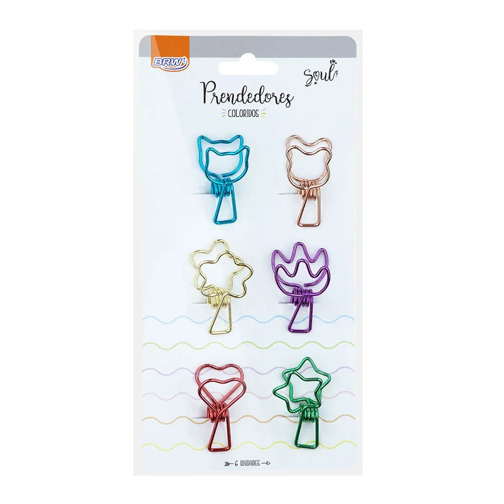 Formatos divertidos e pintura metalizada. Produzidos em arame de aço niquelado, são resistentes à oxidação e não quebram facilmente. Blister sortido nos temas gato, estrela, cacto e coração