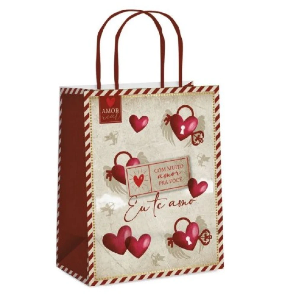 Sacola para presente modelo Amor Real, tamanho M, medindo 26 x 19,5 x 9,5 cm, da marca Cromus. Produzida em papel resistente com acabamento sofisticado, possui alças de cordão e estampa romântica, ideal para presentes delicados e especiais. Indispensável para lojas, floriculturas, papelarias e uso pessoal em datas comemorativas como Dia dos Namorados, aniversários, casamentos e outras celebrações afetivas.