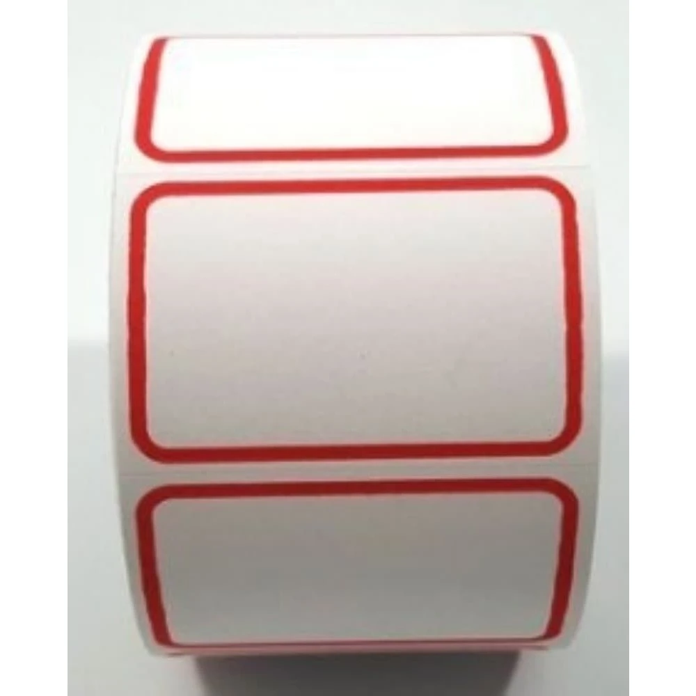 – Etiqueta adesiva em branco fosco com tarja em vermelho;