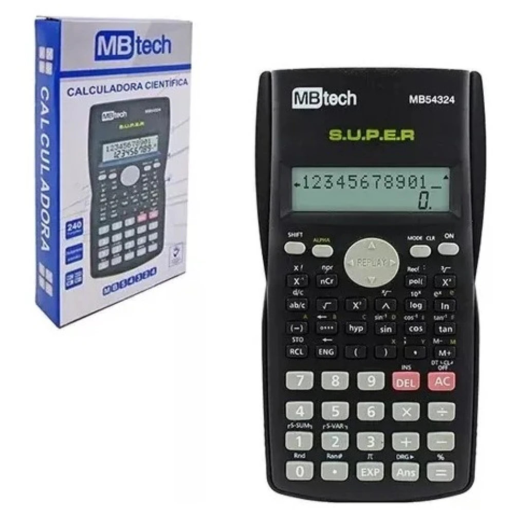 A Calculadora Científica MB54324 da MBTECH tecnologia e funcionalidade. Possui mais de 252 funções para trigonometria, estatística e cálculo de frações exponenciais. Desenvolvida especialmente para facilitar a sua interação com os cálculos, sejam eles mais avançados ou os do seu dia a dia! Características: -Marca Mbtech; -Modelo MB54324; -Tipo de calculadora Científica; -Alimentação 2 pilhas AA (não inclusas); -240 Funções -10 + 2 dígitos; -Display de 2 linhas; -9 Memorias de variáveis; -Trigonometria; -Exponencial; -Tampa protetora de encaixe; -Super visualização das formulas algébricas; -Permutação e combinação; -Cálculo de tempo (graus, horas, minutos e segundos) -Cálculo Fracionário; -Cálculo Seno, Cosseno, Tangente e Arco de cada um; -Cálculo Estatístico: Desvio Padrão e regressivo; -Conversão de sexagesimal para decimal; -Funções hiperbólicas e hiperbólicas Inversas, -Função de repetição e resposta, -Desligamento automático.