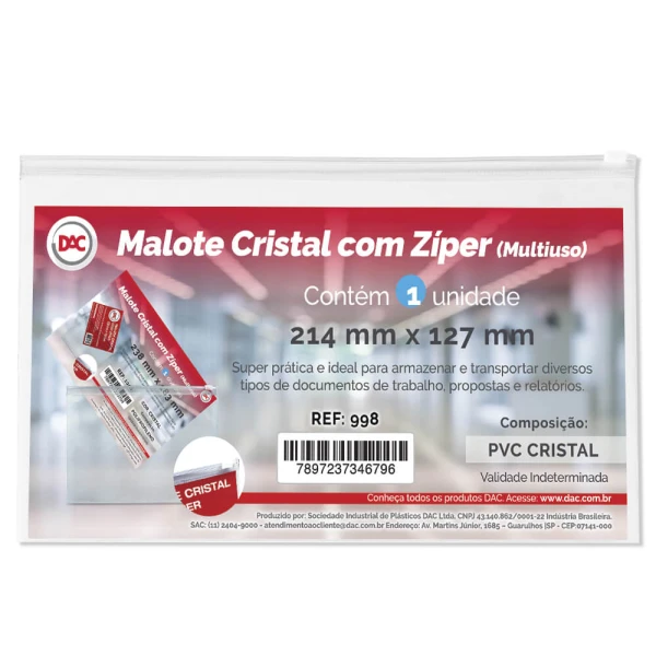 O malote da DAC é um item muito versátil para usar na escola, em casa ou no dia a dia. Ideal para organizar, guardar ou transportar objetos, documentos, materiais escolares entre outros. Produzido em PVC Cristal tranparente é resistente à água, fechamento em zíper slide branco, prático e fácil de levar para qualquer lugar, principalmente itens de higiene, roupinhas infantis, materiais escolares entre outros.