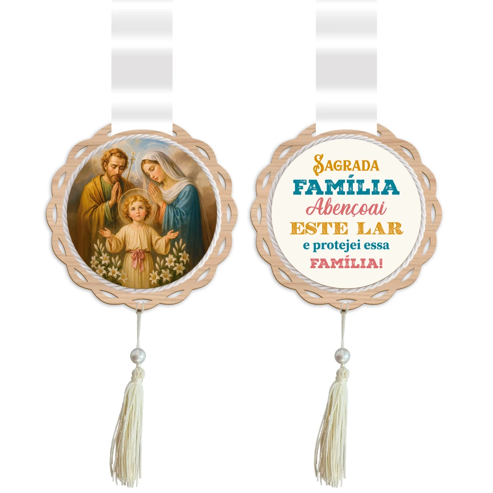 O ESP-003 - Escapulário de Porta Sagrada Família é um adorno religioso fabricado em MDF, projetado para ser pendurado em portas como símbolo de proteção e fé.