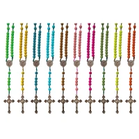 Os terços vão com cores sortidas conforme a disponibilidade, são elas: Marrom, Verde escuro, Azul, rosa, vermelho, laranja, verde limão, azul escuro, amarelo e rosa claro.